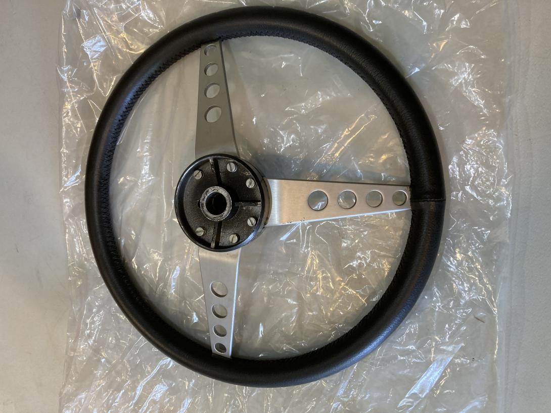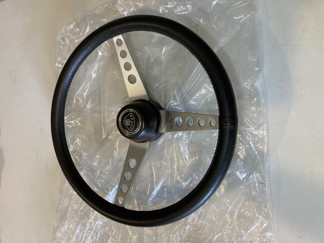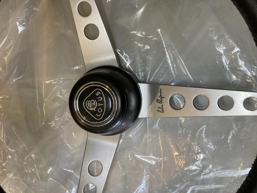 Genuine Lotus steering wheel - removed from my 1971 Elan Sprint. Refurbished by the acclaimed Len Francis. As can be seen in the photos, in super condition. Diameter is 14". Includes boss, and horn push as shown. Some tiny scratches in the horn push badge - see photo.